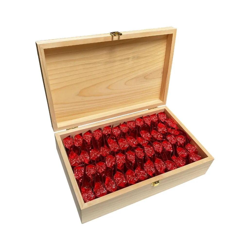 - 🌲 Chất liệu và thiết kế: Vỏ hộp gỗ thông trắng Đà Lạt mộc mạc, có vân sáng đều, chống mối mọt. Nắp hộp khắc laser tinh xảo bức tranh dân gian Đông Hồ “Hứng Dừa” vô cùng ý nghĩa.