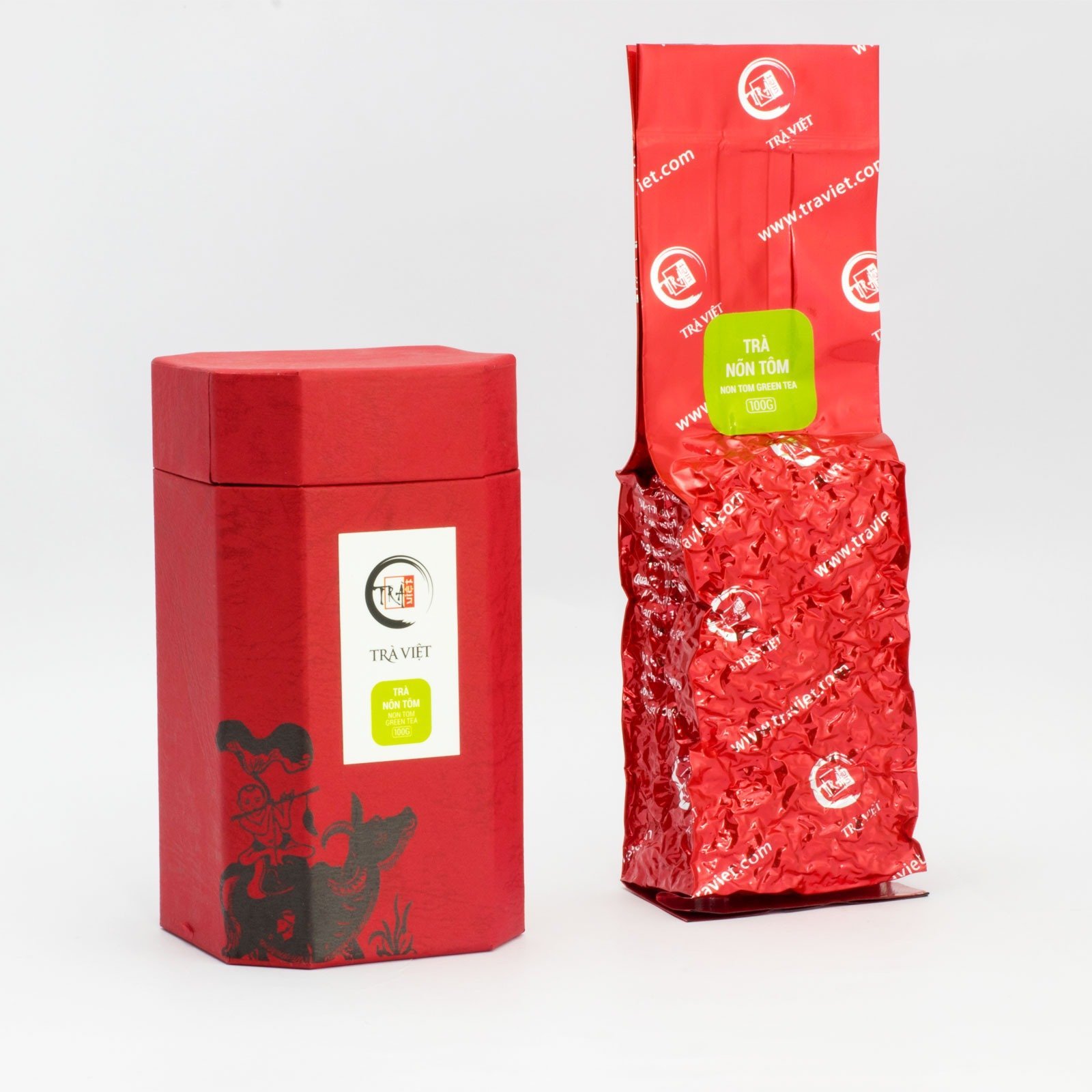 Bộ quà gồm 03 loại trà: Hồng Trà, Trà Nõn Tôm và Trà Sen. Mỗi loại được đóng gói 100g, hút chân không và đặt trong hộp giấy mỹ thuật màu đỏ. Cách đóng gói này mang lại hai lợi ích rất thực tế: dễ bảo quản hơn trong quá trình cất giữ, đồng thời khi mở hộp tổng thể vẫn giữ được sự chỉn chu, đồng bộ.