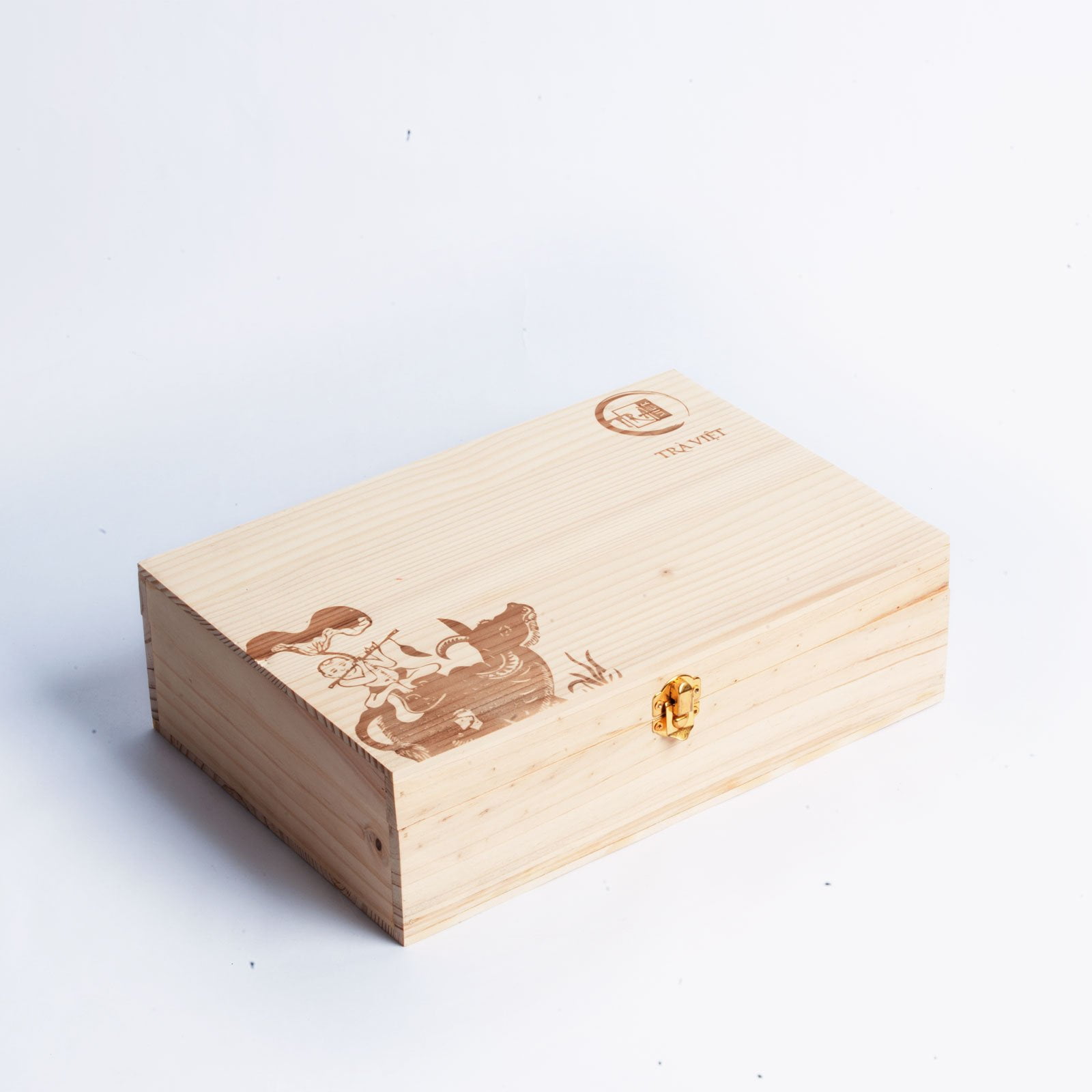 Ấn tượng đầu tiên đến từ phần hộp gỗ. Sản phẩm dùng gỗ thông New Zealand, đi cùng khóa và bản lề bằng đồng, nên tổng thể có cảm giác chắc tay và hoàn thiện hơn kiểu bao bì giấy thông thường. Trên nắp hộp là chi tiết ép nhiệt hoa văn “Mục đồng thổi sáo”, một lựa chọn giàu tính gợi nhớ, khiến bộ quà có chất truyền thống nhưng không cũ. Đây là kiểu chi tiết khi nhìn trực tiếp sẽ thấy hợp với trà: nhẹ, trầm, có nét thủ công và không bị khoa trương.